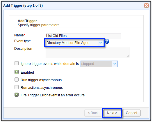 Create a new trigger and give that trigger a name (e.g. “List Old Files”). Expand the Event type drop-down list and then select “Directory Monitor File Aged“. This will enable this trigger to listen to the Directory Monitor File Aged event, which will cause this trigger to fire each time an aged file is found. Click Next to proceed.