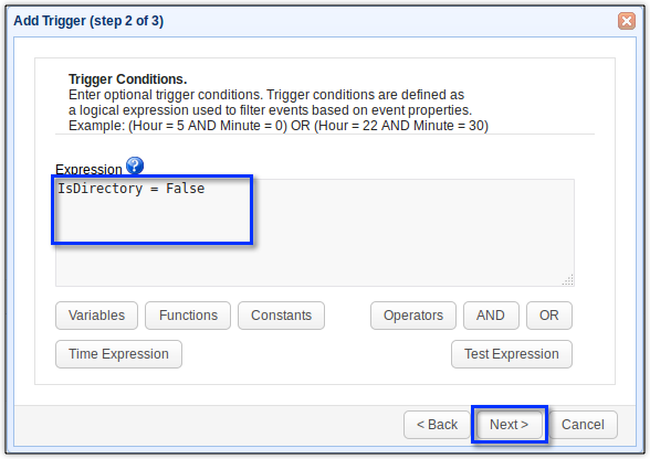 In case you have two or more directory monitors that raise the Directory Monitor File Aged event, you should add an expression that would limit this trigger’s response to the right event. To do that, just specify the directory monitor name. So the complete expression would be: