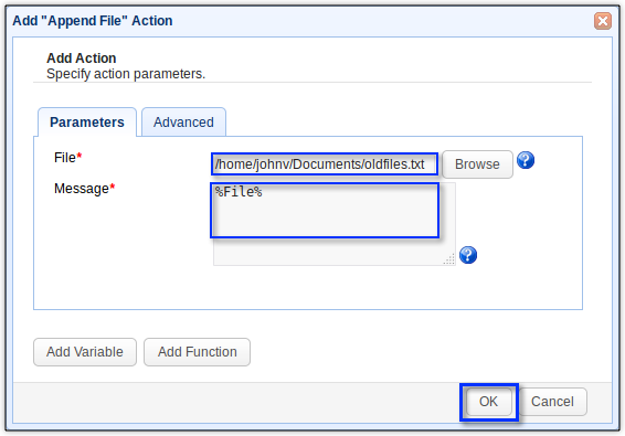 Once you’ve selected the file, enter the %File% variable into the Message box. For this particular trigger, the %File% variable would hold the path of each old file found. Click OK to proceed.